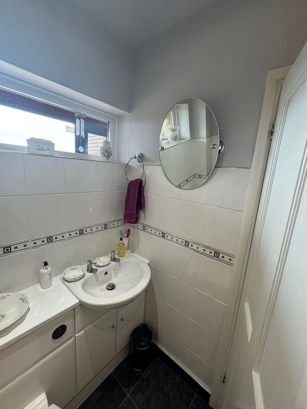 Small downstairs Cloakroom adapted into a shower room for the client with the use of wet room panels for a quick turnaround - with space-saving toilet/basin.